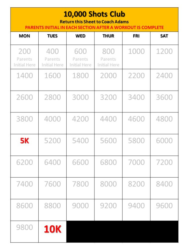 10,000 Shots made over 8 weeks ... It is the program that will change your athlete's mindset about hard work and consistency. Drew McElroy of TCU Men's Basketball has this to say about this program, "It was the first time in my life that I had to do something that no one really helped me with - it was about me and the ball showing up everyday. It showed me what workoing everyday could do for my game at an ealry age." We agree with Drew and the success kids have from doing the program.